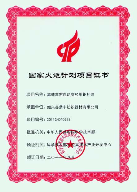浙江鼎豐紡織器材有限公司始建于1986年,是一家專業生產各類無梭織機用鋼筘:噴氣筘、噴水筘、劍桿筘、其他類型鋼筘;鋁合金綜框、鋼片綜、停經片、經軸、織軸、卷布輥等產品及配件的民營企業。